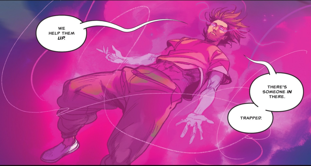 Jo é arremessada para trás por um momento, dando a Hal o tempo necessário para agir. Ele fica envolto em luz, assim como Jo, mas Hal brilha com uma intensa energia rosa.